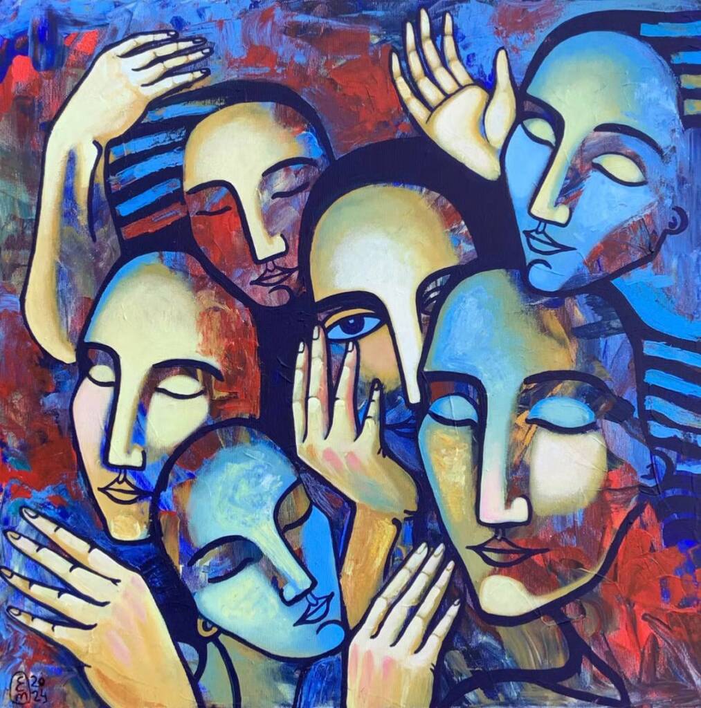 În atelierul Elenei Tomilova, începutul fiecărei lucrări nu are reguli. Prima atingere de pensulă nu caută formă, dar eliberare. Acrilicul este aplicat spontan, fără schiță, fără direcție clară. Un strat de culoare care adună emoție. După ce se usucă, începe căutarea: din acest „haos” apar chipuri, simboluri, linii care prind sens.